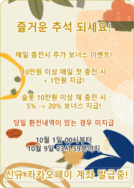 · 당일 마지막 슬롯 충전금액(10만원이상 부터)의 10%를 올인 보너스 지급.
